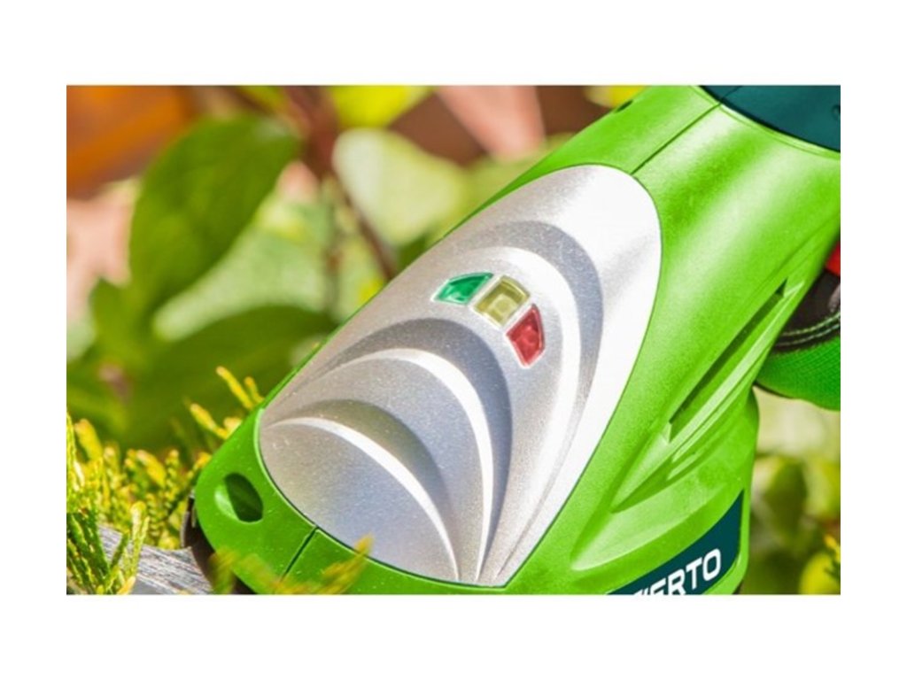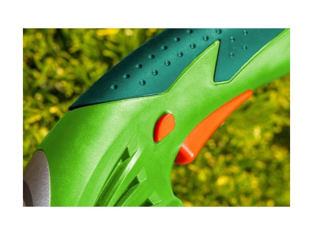 Akumulátorové nožnice na trávu a živý plot sú poháňané 7,2V batériou s kapacitou 1,3 Ah, takže nemusíte hľadať žiadny zdroj elektrickej energie. O stave batérie vás informuje LED indikátor a praktická nabíjacia stanica zariadi, aby bol zastrihávač stále k dispozícii.