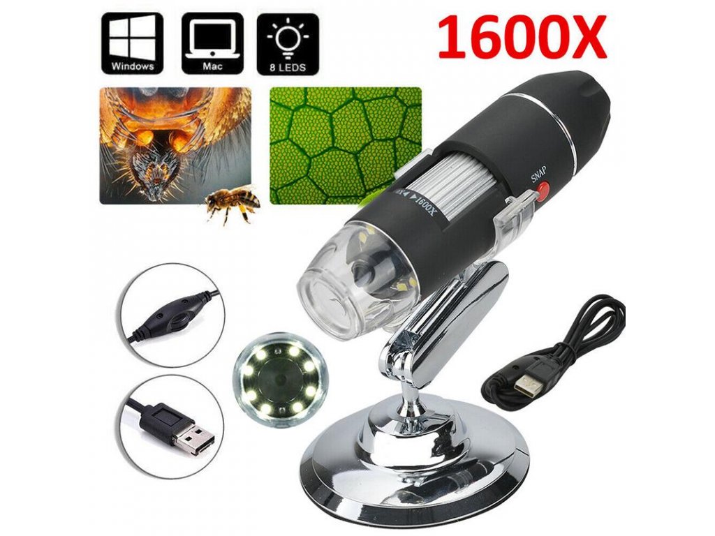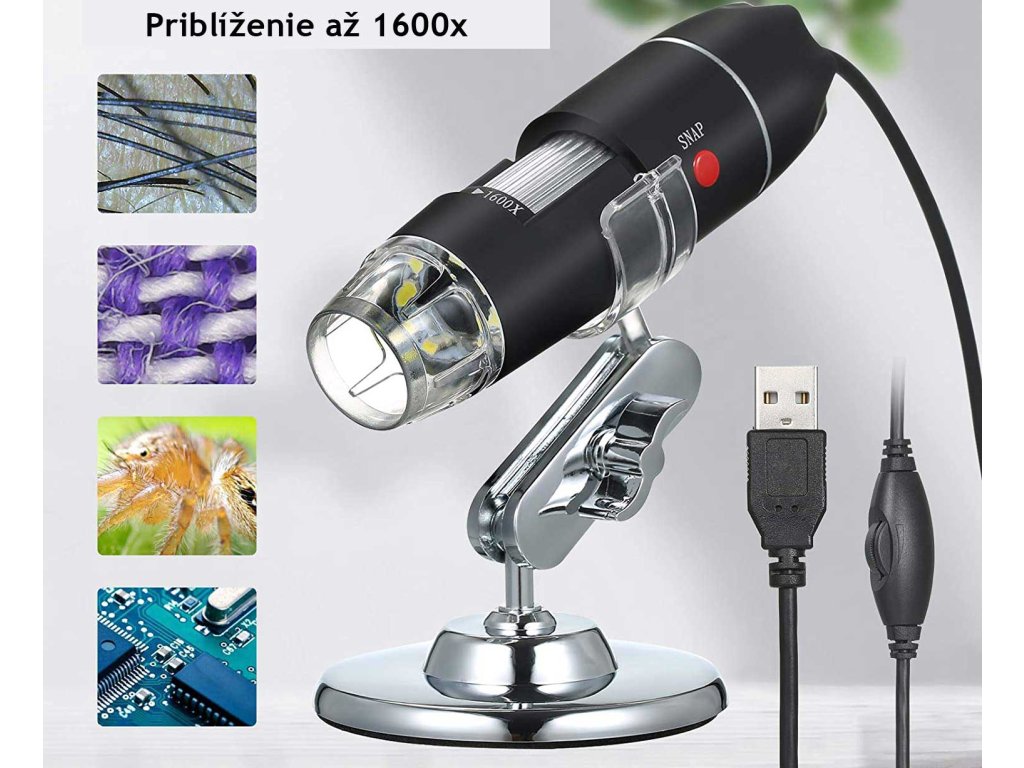 Digitálny mikroskop s priblížením až 1600-krát vám umožní presne vidieť veci, ktoré sú voľným okom neviditeľné, ako napríklad hmyz, rastliny, tkanivá, materiály a iné.