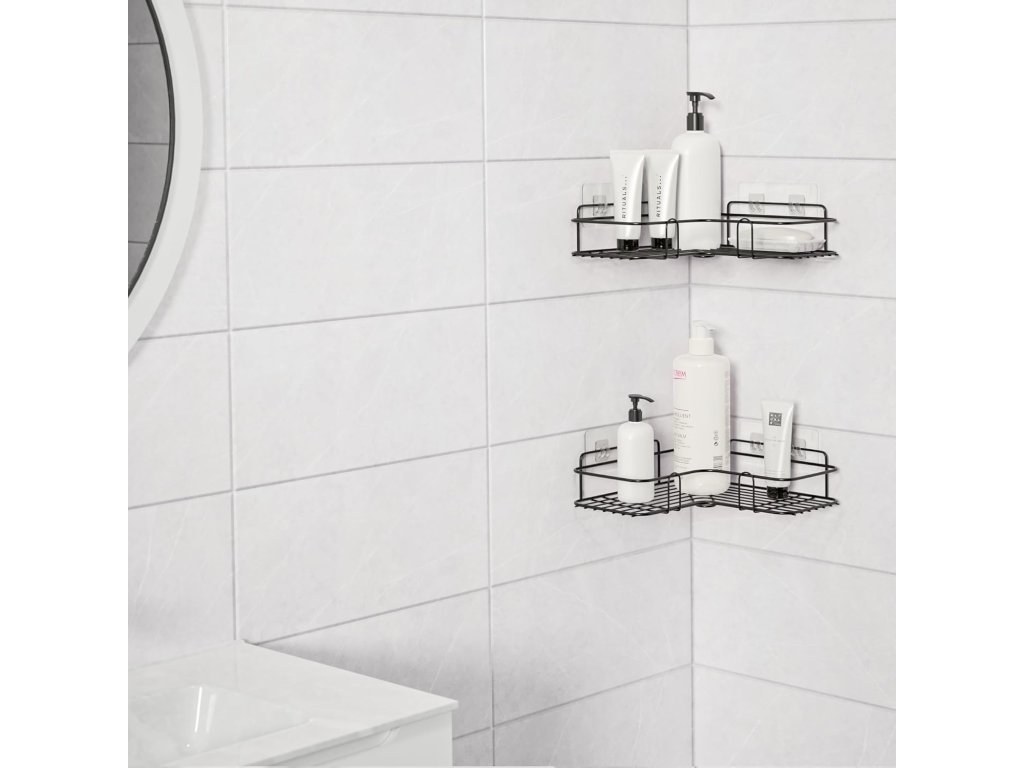Unikátne nástenné rohové police umožňujú udržiavať hygienické potreby usporiadané a dostupné bez neporiadku. Každá z políc poskytuje dostatočný priestor na šampóny, sprchové gély, mydlá či holiace potreby. Osem háčikov navyše poslúži na zavesenie uterákov, žiniek alebo kefiek.