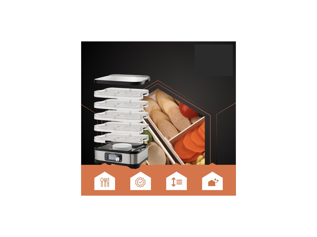 Obdĺžnikový tvar základne a 5 poschodí umožňujú rovnomerné rozloženie veľkého počtu plátkov jedla. Bude teda naozaj veľmi praktickým doplnkom vo vašej kuchyni.