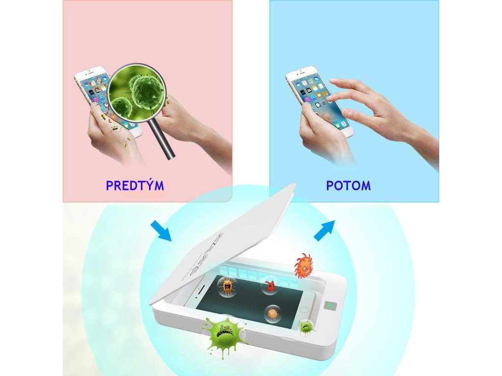 Sterilizačný box je užitočná pomôcka pre každého. Váš mobil zbaví akýchkoľvek baktérií a vírusov. Je kompatibilný pre všetky mobilné zariadenia do 6,5 palca ako je iPhone, Samsung, Nexus, LG, Motorola, Sony, HTC, Huawei, Honor a iné.