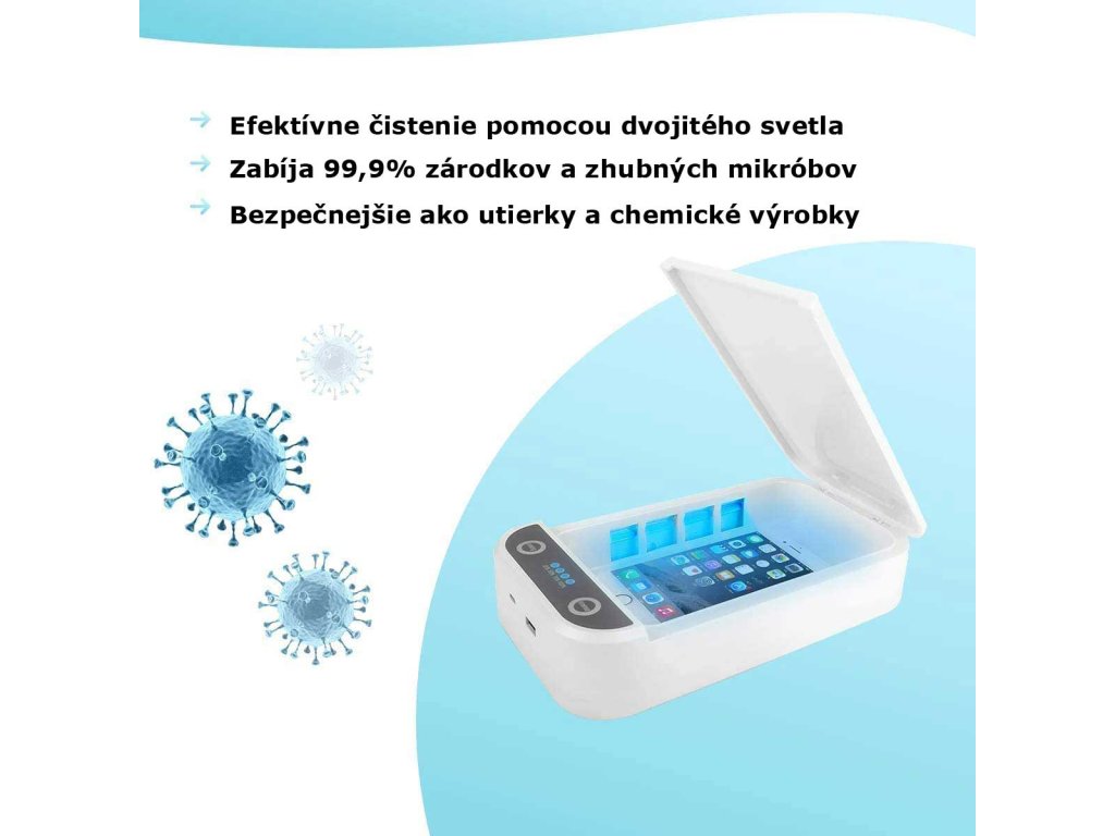 Toto jedinečné zariadenie je pohodlný a bezpečný spôsob sterilizácie vaších mobilov a iných drobností. Nemusíte sa báť, že sa vaše zariadenie nejako poškodí. Pri dokonalej dezinfekcii nie je potrebné žiadne teplo, tekutiny a chemikálie, ktoré by mohli poškodiť vaše zariadenie. Vysoká účinnosť UV svetla dokonale sterilizuje a je úplne bezpečná k vaším predmetom.