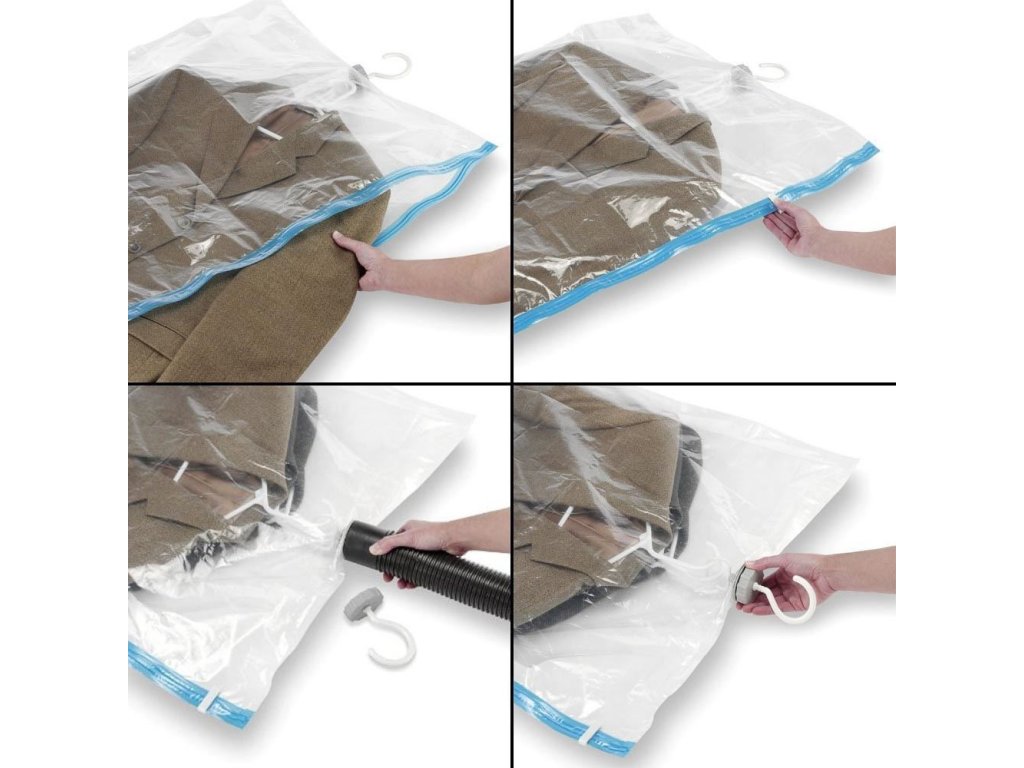Vákuové vrecia sa používajú úplne jednoducho a zvládne to naozaj každý. Najprv do vákuového vrecia vložte veci, ktoré chcete uskladniť a potom ho uzavrite pomocou pribalenej spony. Následne už len stačí klasickým vysávačom vysať vzduch cez určený ventil.